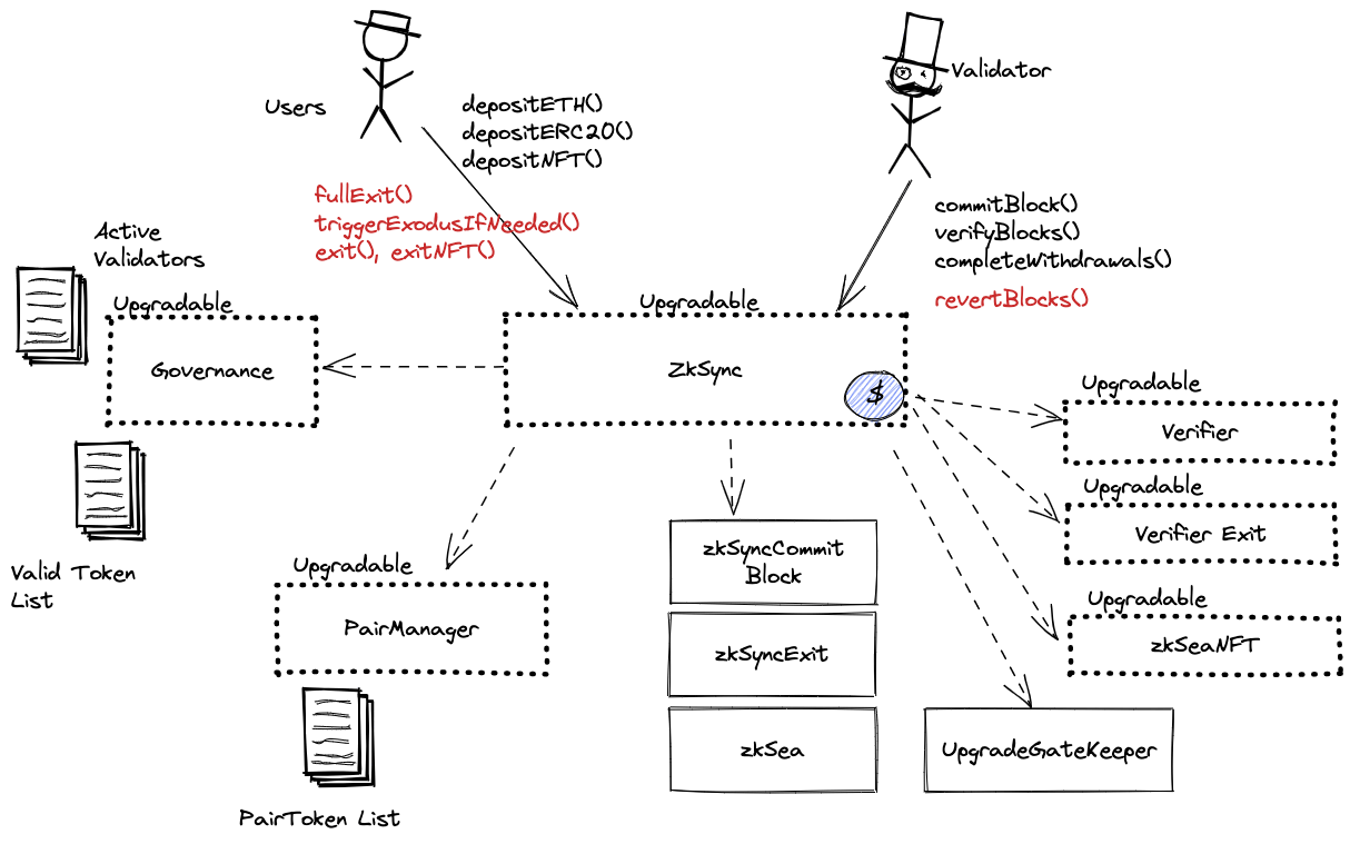 The main Rollup contract. Operator commits blocks, provides ZK proof which is validated by the Verifier contract and process withdrawals (executes blocks). Users deposit ETH and ERC20 tokens. This contract defines the upgrade delay in the UPGRADE_NOTICE_PERIOD constant that is currently set to 8 days.